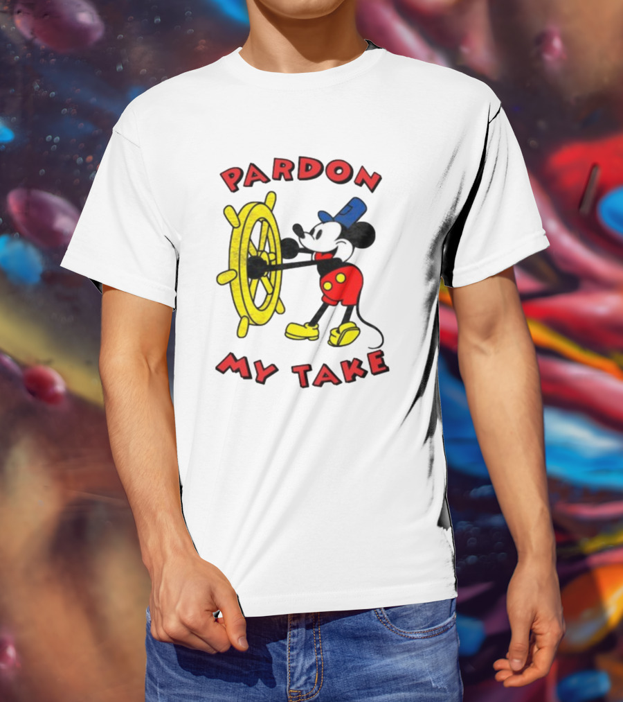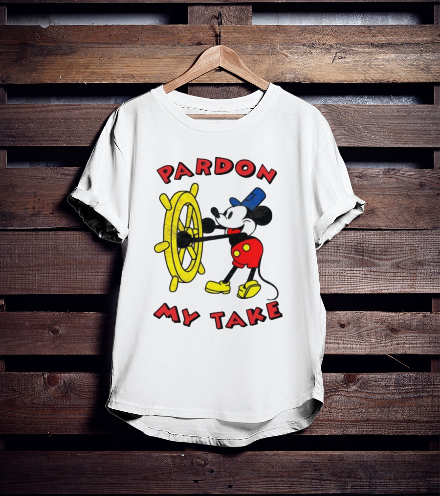 This Pardon My Take Steamboat Wheel Mickey Shirt is constructed for regular, casual wear. Made from 100% ring-spun cotton, known for its softness. It's pre-shrunk to help maintain shape after washing. The regular fit offers a standard silhouette suitable for various body types (available in S-5XL) and conforms to standard U.S. sizing. Suitable as a standalone casual shirt or a base layer. Printed and shipped from Charlotte, North Carolina, USA.