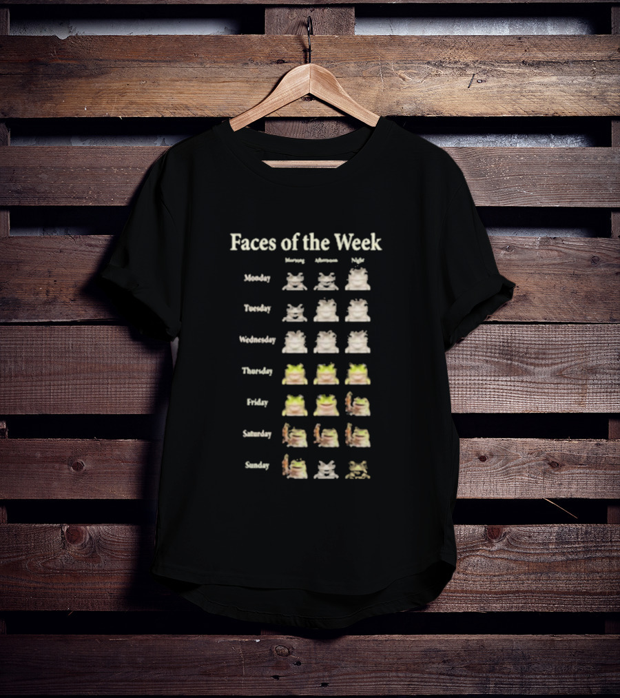 This Faces of the Week Funny Frog Memes Monday to Sunday Shirt is constructed for regular, casual wear. Made from 100% ring-spun cotton, known for its softness. It's pre-shrunk to help maintain shape after washing. The regular fit offers a standard silhouette suitable for various body types (available in S-5XL) and conforms to standard U.S. sizing. Suitable as a standalone casual shirt or a base layer. Printed and shipped from Charlotte, North Carolina, USA.