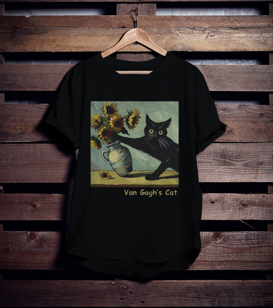 Van Gogh's Cat Sunflowers Funny Art Parody Cat Hugging Vase Painting T-Shirt