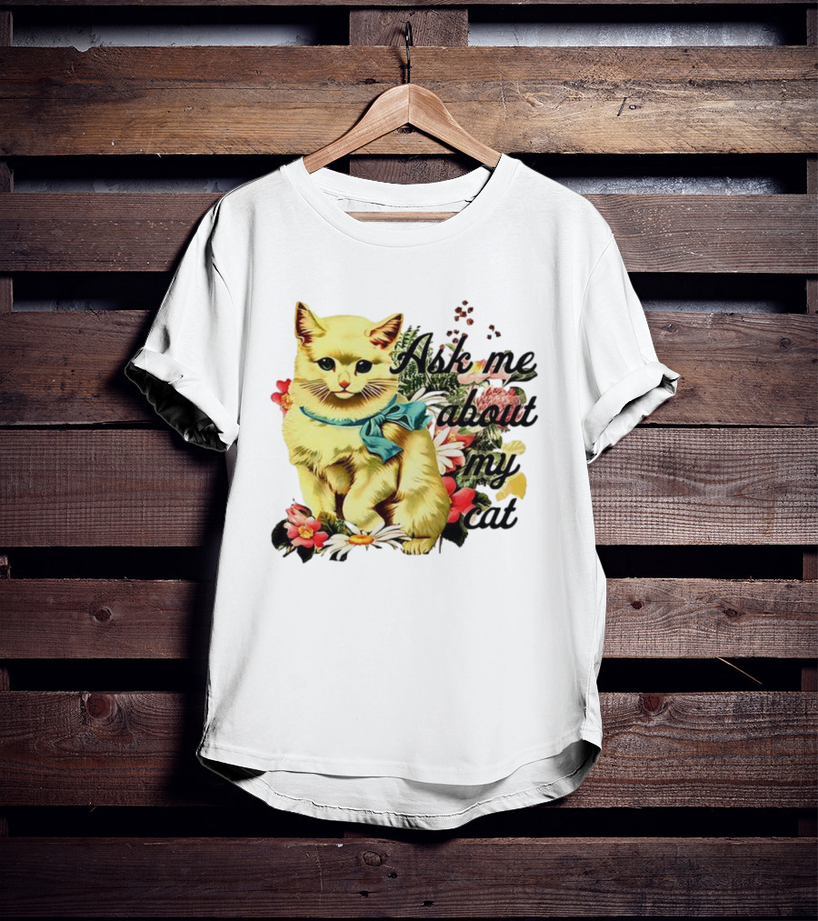 This Ask Me About My Cat Vintage Floral Kitten Illustration Shirt is constructed for regular, casual wear. Made from 100% ring-spun cotton, known for its softness. It's pre-shrunk to help maintain shape after washing. The regular fit offers a standard silhouette suitable for various body types (available in S-5XL) and conforms to standard U.S. sizing. Suitable as a standalone casual shirt or a base layer. Printed and shipped from Charlotte, North Carolina, USA.