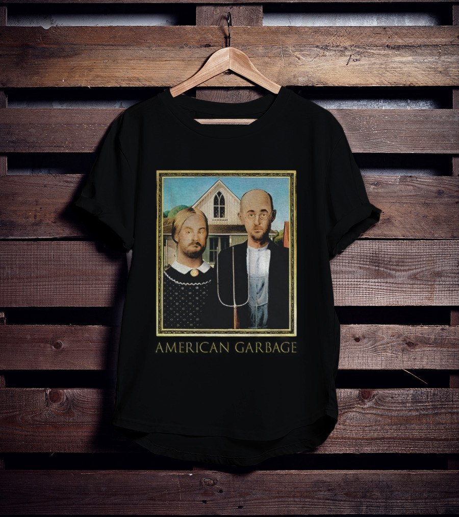 This American Gothic American Garbage Mock Artwork Featured Shirt is constructed for regular, casual wear. Made from 100% ring-spun cotton, known for its softness. It's pre-shrunk to help maintain shape after washing. The regular fit offers a standard silhouette suitable for various body types (available in S-5XL) and conforms to standard U.S. sizing. Suitable as a standalone casual shirt or a base layer. Printed and shipped from Charlotte, North Carolina, USA.