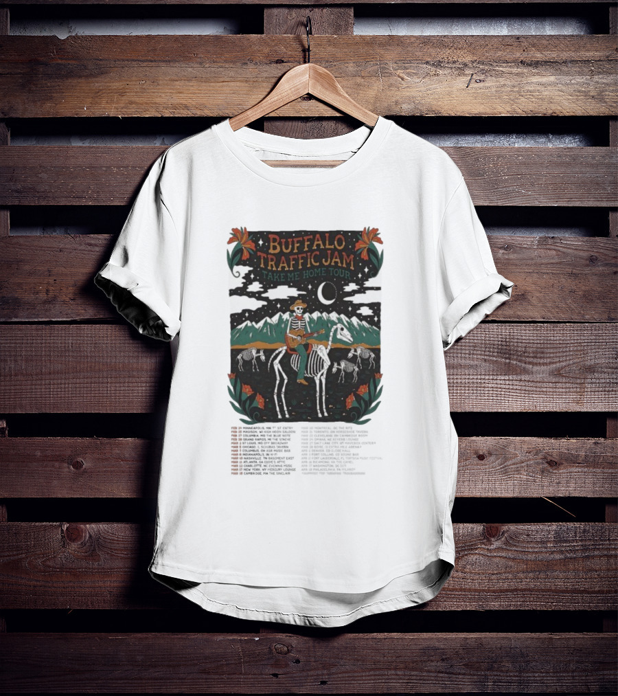 Buffalo Traffic Jam Take Me Home Tour 2026 Dates Skeleton Cowboy Riding Horse Moonlit Desert Scene T-Shirt