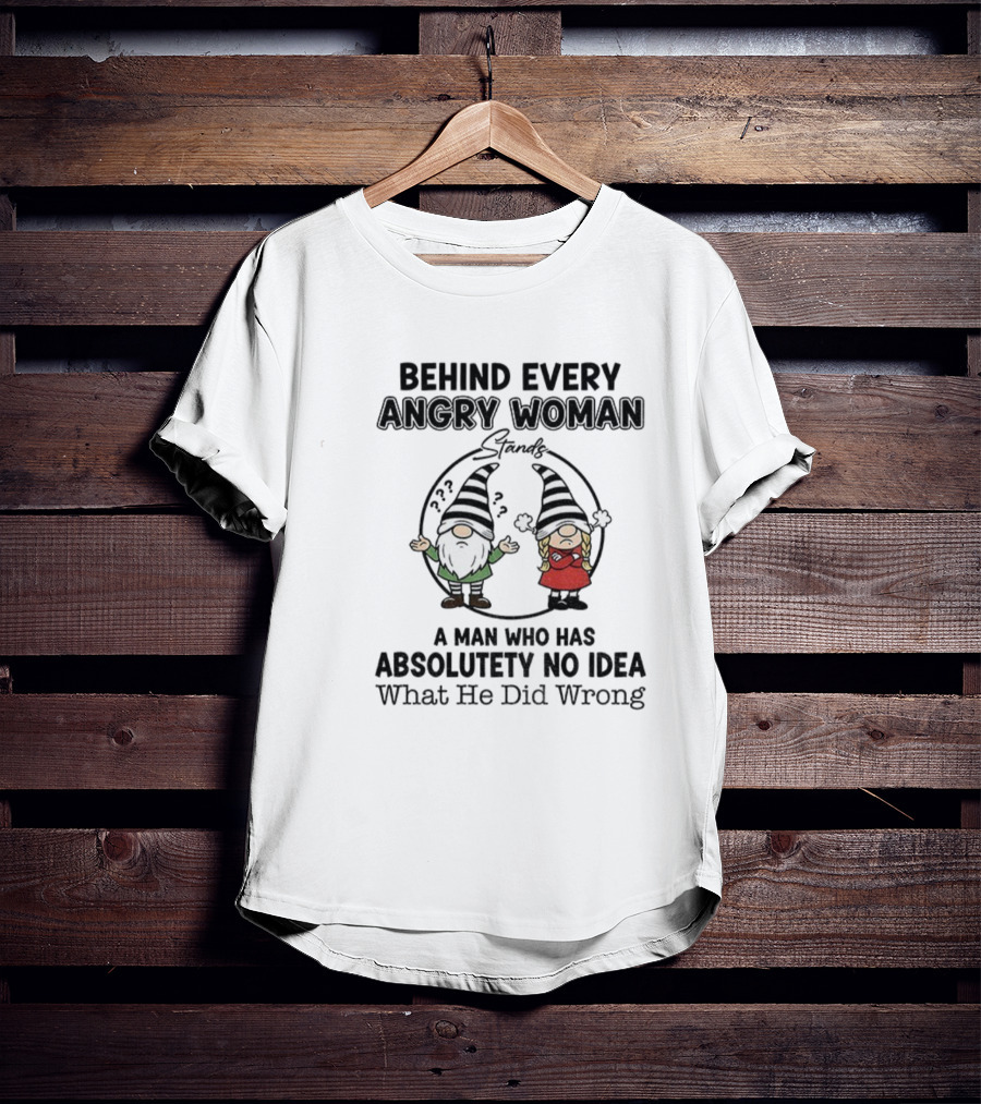 Behind Every Angry Woman Gnome A Man Who Has Absolutely No Idea What He Did Wrong T-Shirt