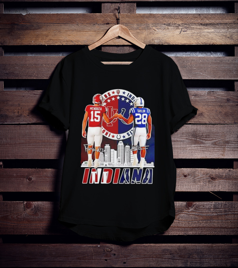 Indiana Hoosiers Mendoza 15 Indianapolis Colts Taylor 28 Signatures And City Skyline T-Shirt
