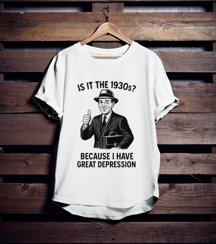 This Is It the 1930s Because I Have Great Depression Thumbs Up Suit Briefcase Shirt is constructed for regular, casual wear. Made from 100% ring-spun cotton, known for its softness. It's pre-shrunk to help maintain shape after washing. The regular fit offers a standard silhouette suitable for various body types (available in S-5XL) and conforms to standard U.S. sizing. Suitable as a standalone casual shirt or a base layer. Printed and shipped from Charlotte, North Carolina, USA.