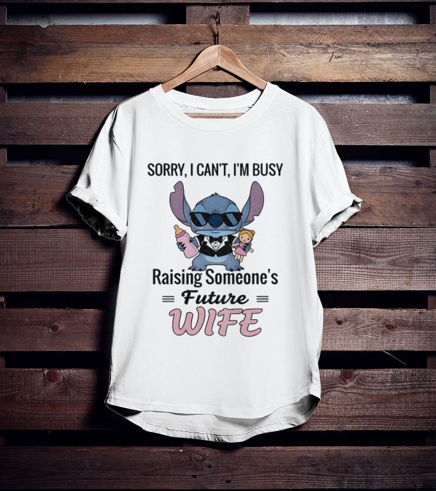 Sorry I Can’t I’m Busy Raising Someone’s Future Wife Stitch Character Holding Baby Bottle And Doll T-Shirt