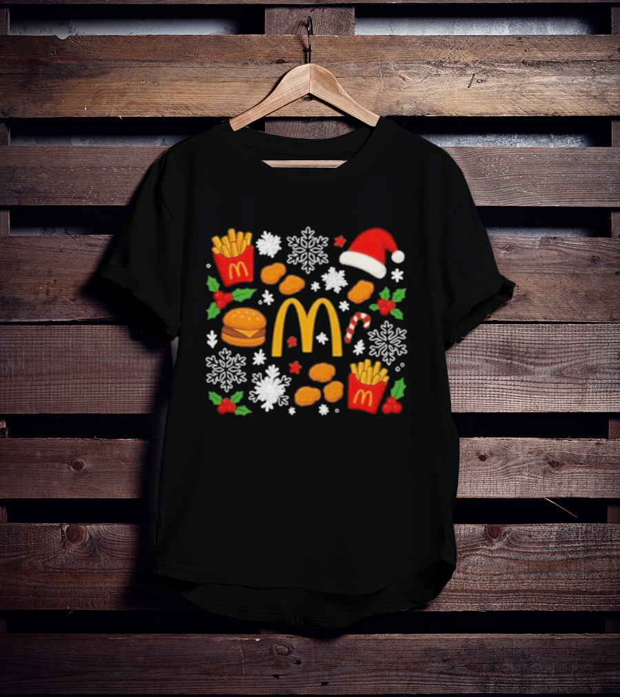 McDonald's Holiday Merry Christmas Fries Nuggets Snowflakes Candy Cane Santa Hat T-Shirt