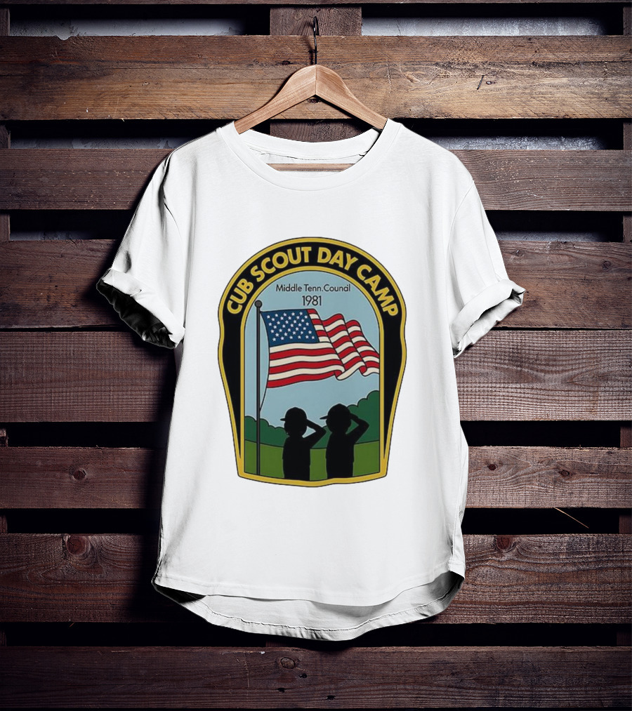 This Cub Scout Day Camp Middle Tennessee Council 1981 American Flag Shirt is constructed for regular, casual wear. Made from 100% ring-spun cotton, known for its softness. It's pre-shrunk to help maintain shape after washing. The regular fit offers a standard silhouette suitable for various body types (available in S-5XL) and conforms to standard U.S. sizing. Suitable as a standalone casual shirt or a base layer. Printed and shipped from Charlotte, North Carolina, USA.