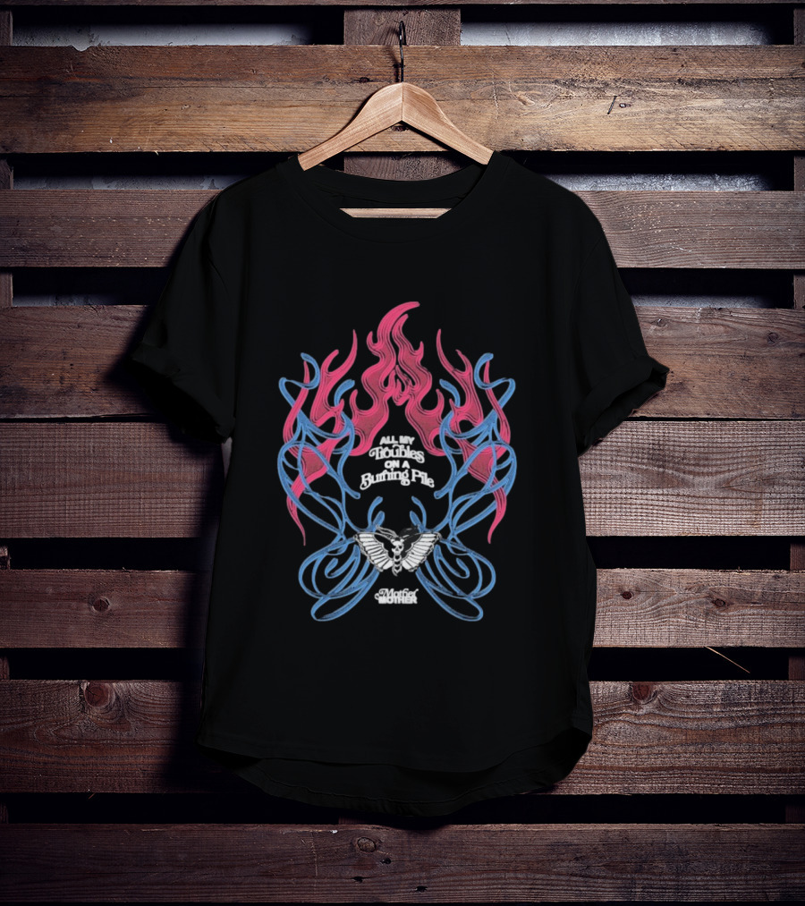 Mother Mother All My Troubles Burning Pile Flame Skull Wings T-Shirt