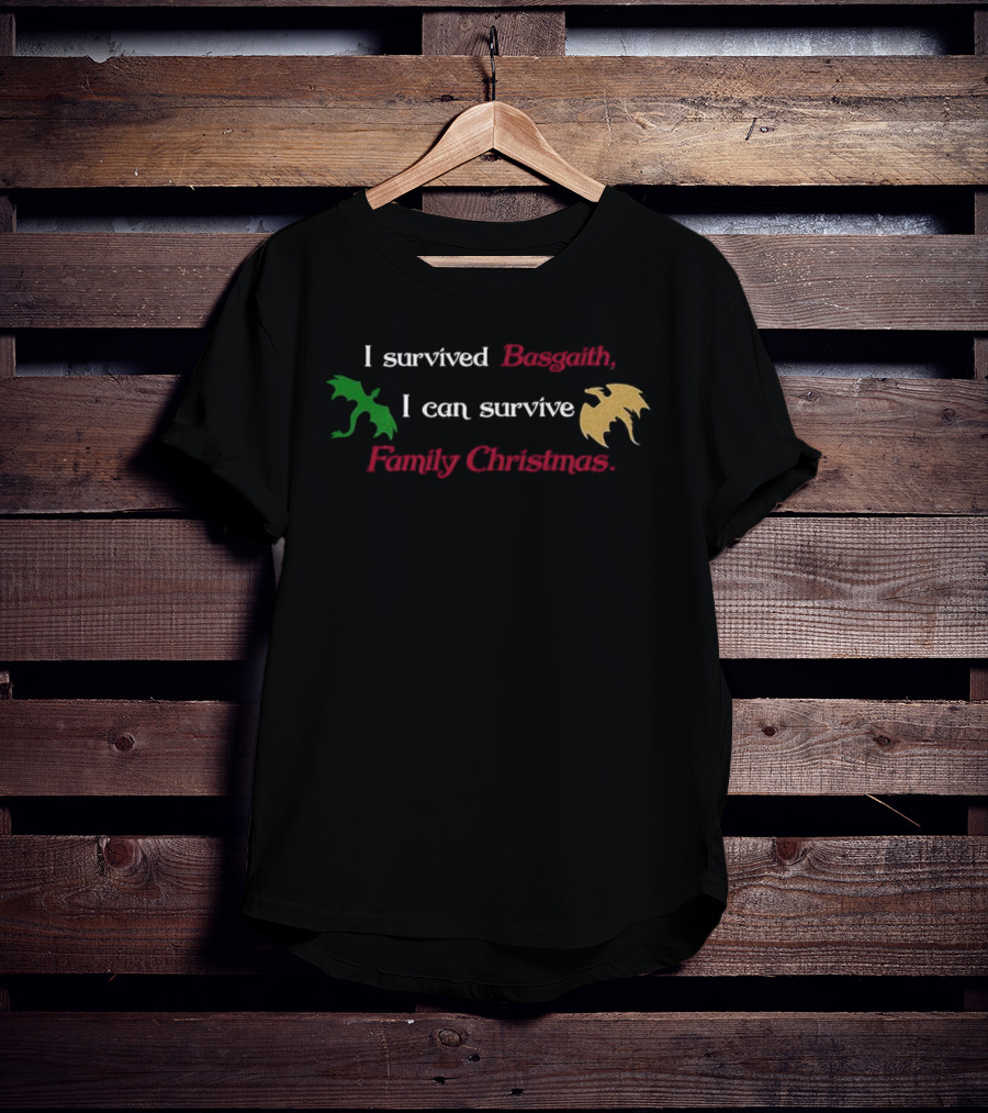 This I Survived Basgiath I Can Survive Family Christmas Dragon Humor Shirt is constructed for regular, casual wear. Made from 100% ring-spun cotton, known for its softness. It's pre-shrunk to help maintain shape after washing. The regular fit offers a standard silhouette suitable for various body types (available in S-5XL) and conforms to standard U.S. sizing. Suitable as a standalone casual shirt or a base layer. Printed and shipped from Charlotte, North Carolina, USA.