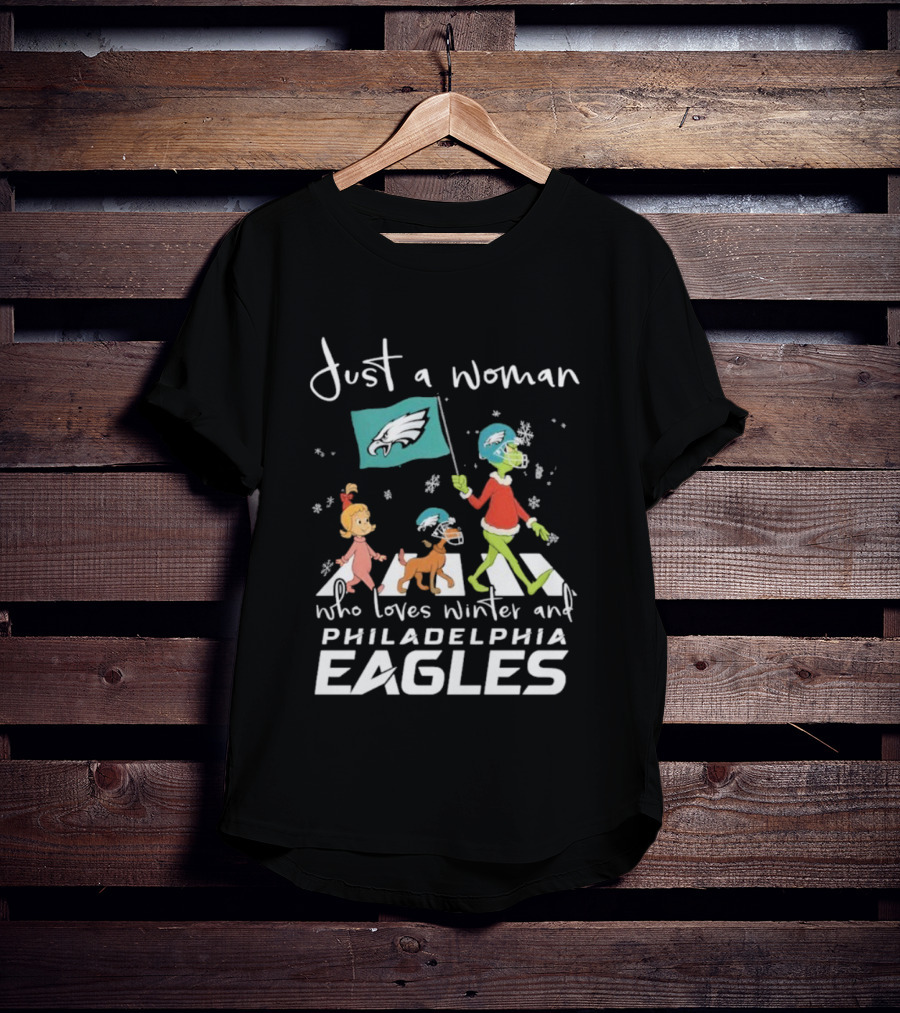 Just A Woman Who Loves Winter Philadelphia Eagles Grinch Cindy Lou Who Max Abbey Road Christmas T-Shirt