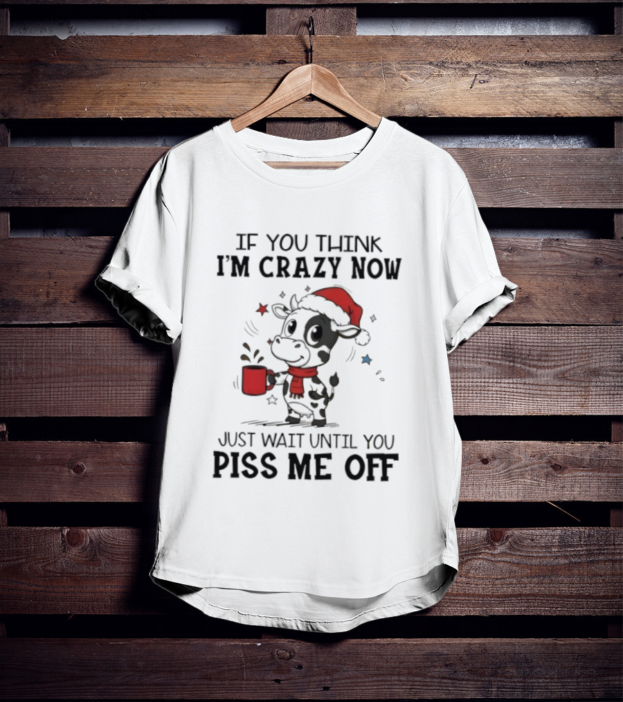This Cow If You Think I'm Crazy Now Santa Hat Holiday Humor Just Wait Until You Piss Me Off Shirt is constructed for regular, casual wear. Made from 100% ring-spun cotton, known for its softness. It's pre-shrunk to help maintain shape after washing. The regular fit offers a standard silhouette suitable for various body types (available in S-5XL) and conforms to standard U.S. sizing. Suitable as a standalone casual shirt or a base layer. Printed and shipped from Charlotte, North Carolina, USA.