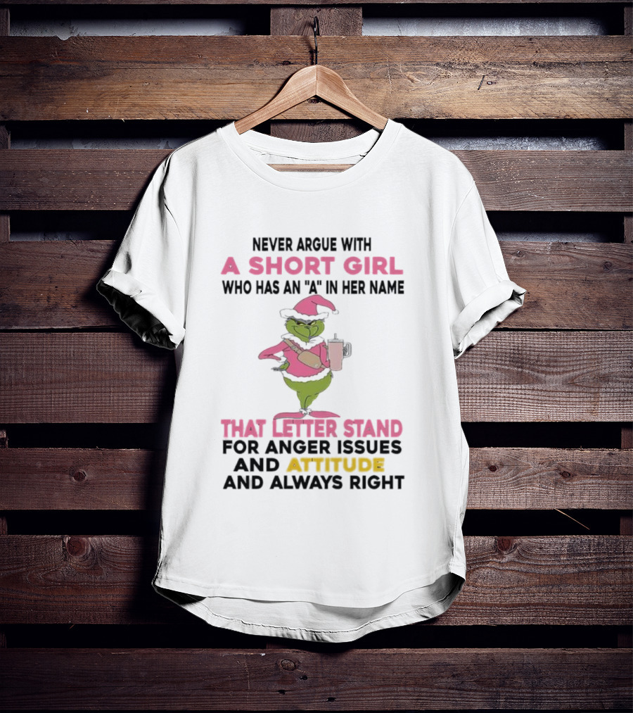 This Grinch Pink Hat Never Argue with a Short Girl A in Her Name Attitude Always Right Shirt is constructed for regular, casual wear. Made from 100% ring-spun cotton, known for its softness. It's pre-shrunk to help maintain shape after washing. The regular fit offers a standard silhouette suitable for various body types (available in S-5XL) and conforms to standard U.S. sizing. Suitable as a standalone casual shirt or a base layer. Printed and shipped from Charlotte, North Carolina, USA.