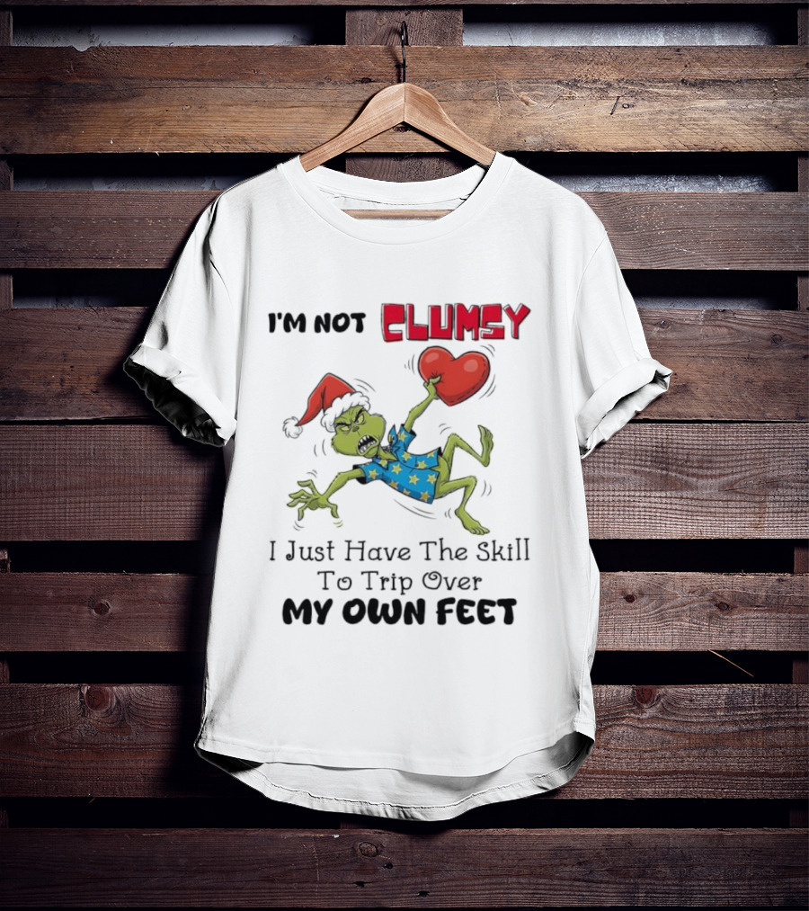 This I'm Not Clumsy Grinch Santa Hat I Just Have The Skill To Trip Over My Own Feet Shirt is constructed for regular, casual wear. Made from 100% ring-spun cotton, known for its softness. It's pre-shrunk to help maintain shape after washing. The regular fit offers a standard silhouette suitable for various body types (available in S-5XL) and conforms to standard U.S. sizing. Suitable as a standalone casual shirt or a base layer. Printed and shipped from Charlotte, North Carolina, USA.