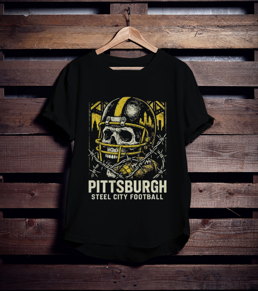 Pittsburgh Steel City Football Skull Helmet Barbed Wire Bridge Skyline T-Shirt