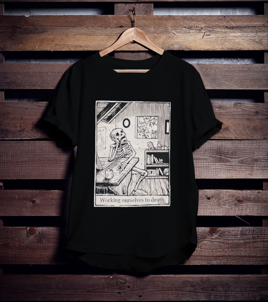 Working Ourselves To Death Skeleton At Home Office Desk Vintage Comic Style T-Shirt