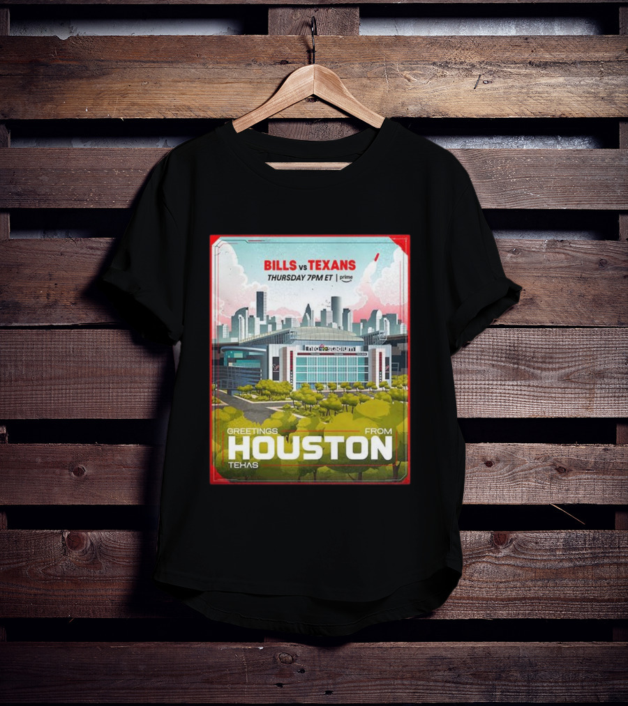 This Greetings from Houston Texans vs Bills Thursday 7PM ET NRG Stadium Shirt is constructed for regular, casual wear. Made from 100% ring-spun cotton, known for its softness. It's pre-shrunk to help maintain shape after washing. The regular fit offers a standard silhouette suitable for various body types (available in S-5XL) and conforms to standard U.S. sizing. Suitable as a standalone casual shirt or a base layer. Printed and shipped from Charlotte, North Carolina, USA.
