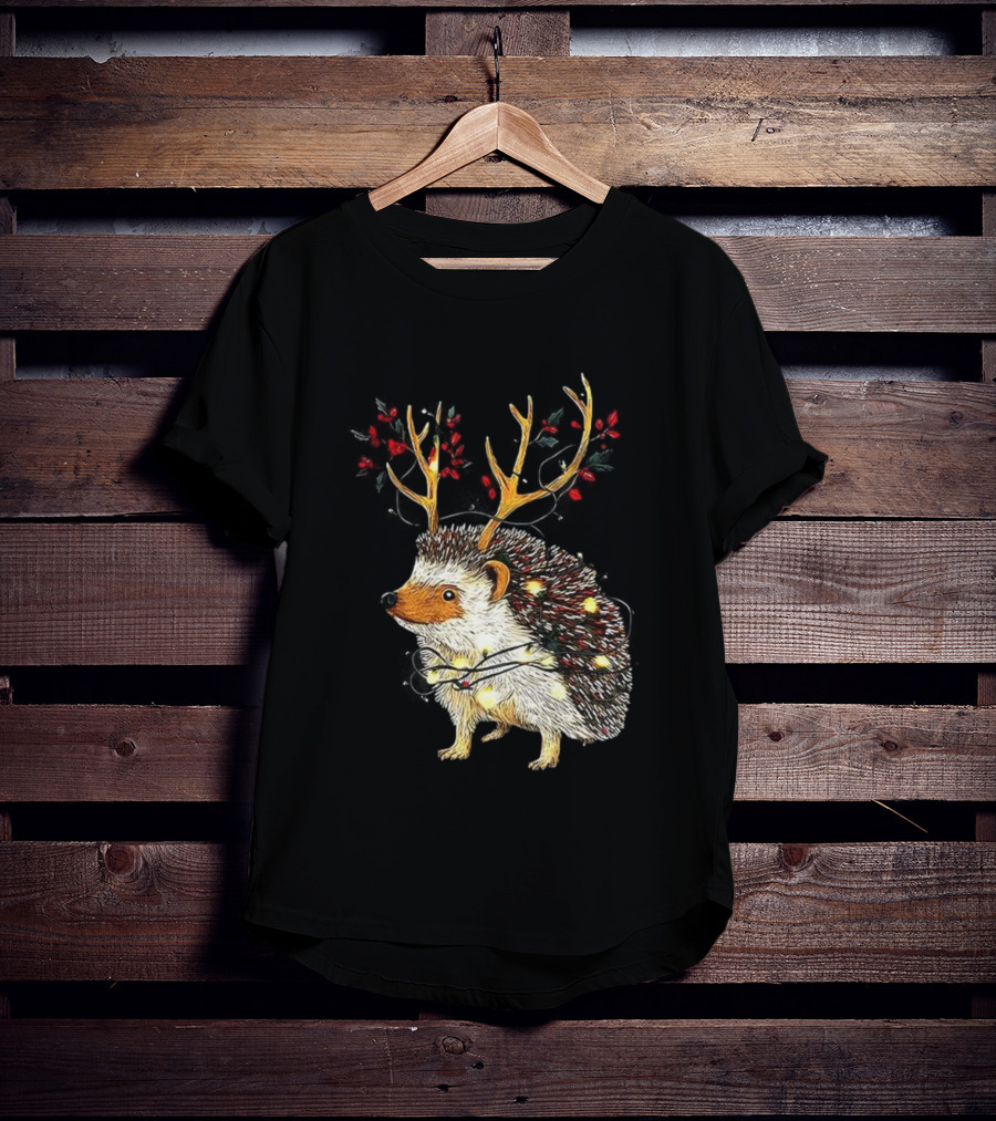 Hedgehog With Antlers Wearing String Of Lights Christmas Holiday Design T-Shirt