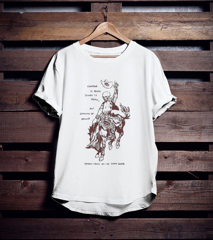 This Courage Is Being Scared to Death But Saddling Up Anyway Broken Bow John Wayne Sketch Cowboy Riding Horse Shirt is constructed for regular, casual wear. Made from 100% ring-spun cotton, known for its softness. It's pre-shrunk to help maintain shape after washing. The regular fit offers a standard silhouette suitable for various body types (available in S-5XL) and conforms to standard U.S. sizing. Suitable as a standalone casual shirt or a base layer. Printed and shipped from Charlotte, North Carolina, USA.