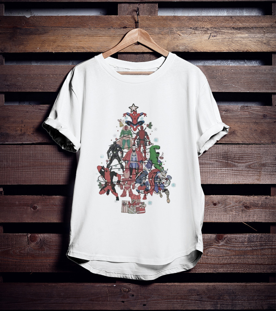 Marvel Superheroes Christmas Tree With Iconic Characters And Festive Star Topper T-Shirt