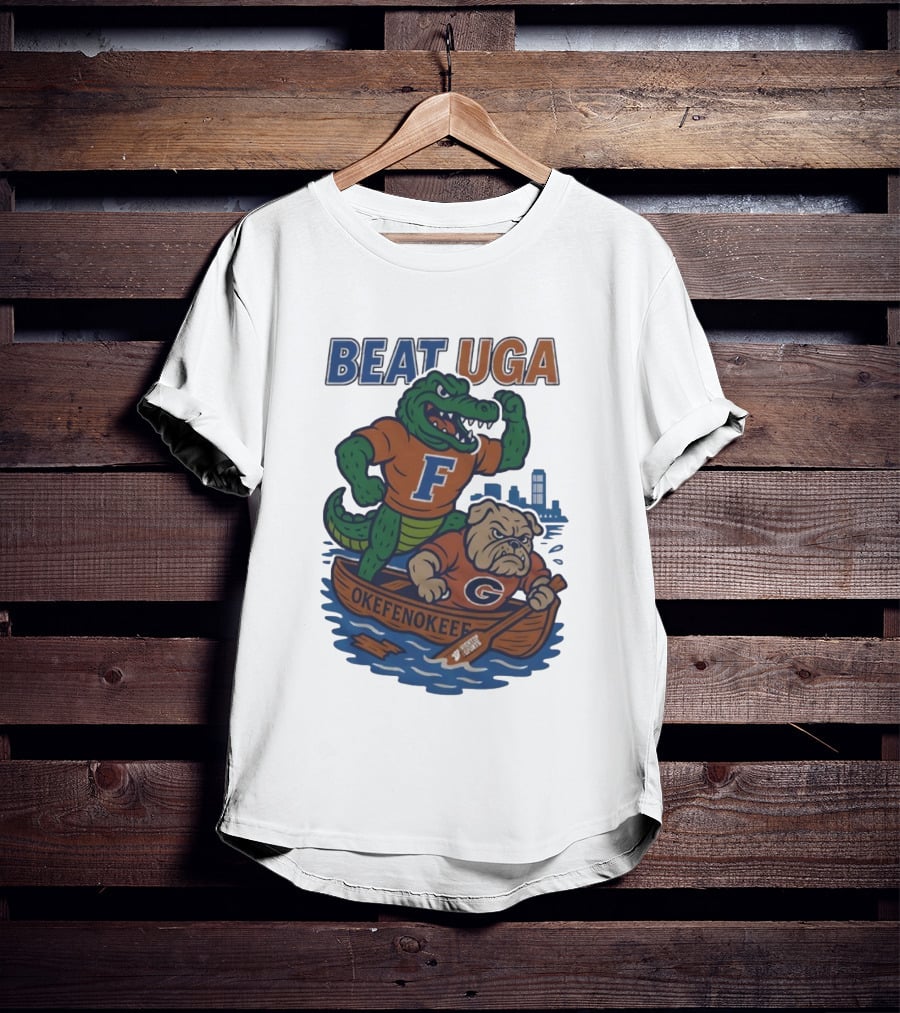 This Beat UGA Florida Gators vs Georgia Bulldogs Okefenokee Rivalry Shirt is constructed for regular, casual wear. Made from 100% ring-spun cotton, known for its softness. It's pre-shrunk to help maintain shape after washing. The regular fit offers a standard silhouette suitable for various body types (available in S-5XL) and conforms to standard U.S. sizing. Suitable as a standalone casual shirt or a base layer. Printed and shipped from Charlotte, North Carolina, USA.