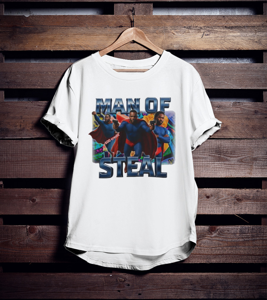 Man Of Steal Superhero Parody With 100 Credit Text T-Shirt