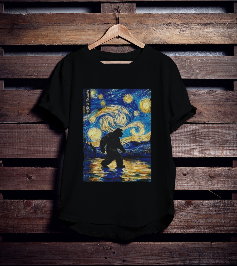 Bigfoot Stroll Under Starry Night Van Gogh Style Japanese Text T-Shirt